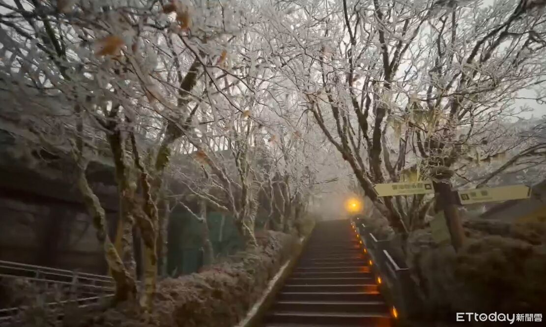 畫面可見,太平山遊樂區的樹木都佈滿雪白的晶體,白茫茫的夢幻美景一早就吸引大批遊客入園,大家不畏寒冷,踩在結霜的地板上開心賞景。