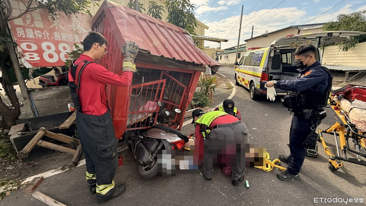 ▲屏東一名女騎士撞進福德祠,左小腿遭夾困 。(圖/記者陳崑福翻攝)