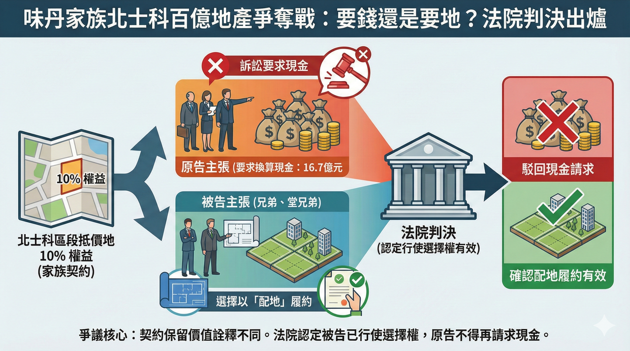 味丹集團楊氏家族因北投士林科技園區區段徵收分回的高價抵價地,爆發鉅額家族訴訟。楊文宗的配偶與子女提告主張,2008年簽署的契約約定保留土地總價值10%權益,抵價地點交後應鑑價換算現金,金額高達16.7億元;被告則主張契約屬「選擇之債」,已選擇以配地履約。士林地院認定選擇權行使有效,駁回原告請求。