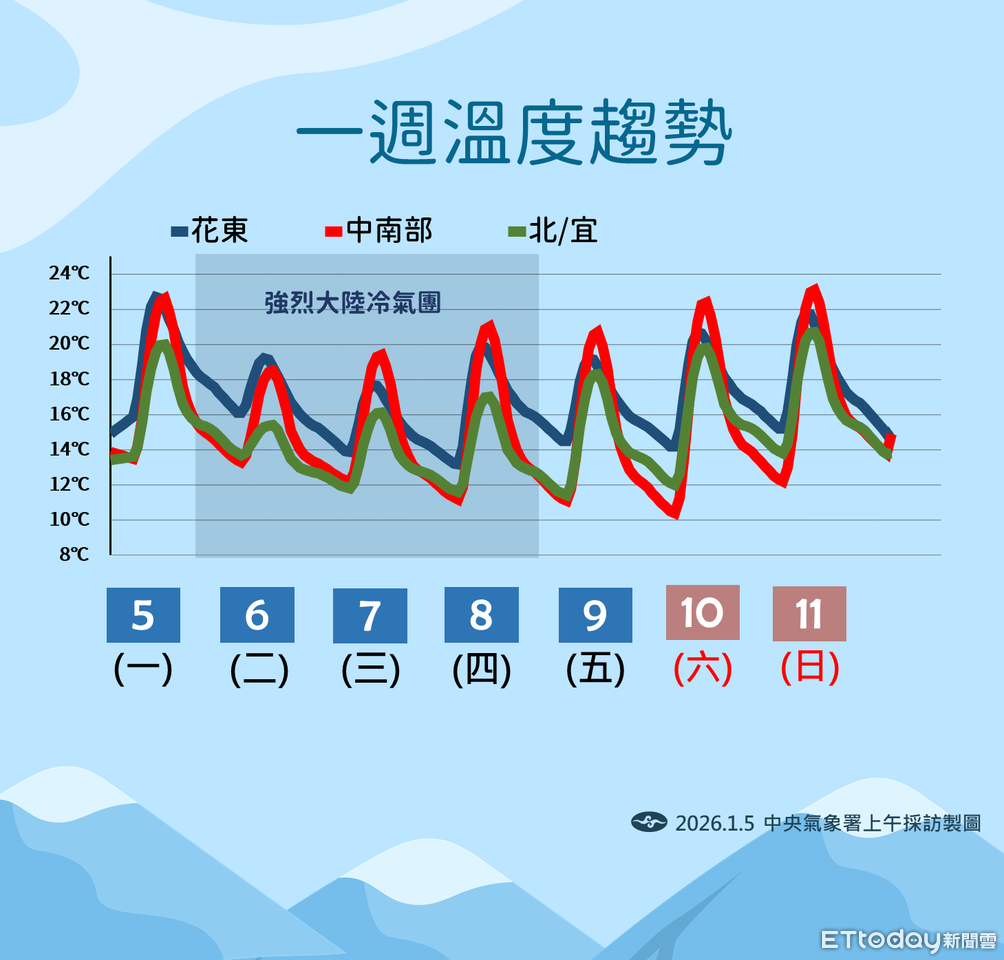 溫度方面,趙竑指出,今天白天各地高溫仍有20度以上,下午起冷空氣南下,北部逐漸降溫,中南部預計明天跟著降溫,最冷時間點在周二晚間到周三清晨,西半部低溫下探10至13度,東半部13至16度。周三至周四逐漸轉乾,北部整天偏涼,中南部日夜溫差大。周五至下周日冷空氣減弱,輻射冷卻持續影響,日夜溫差仍有10度。