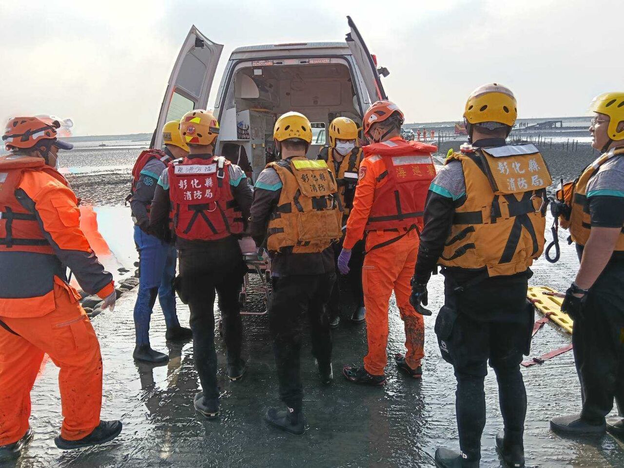 彰化縣消防局與海巡署中部分署第三岸巡隊獲報後,立即出動各式消防車輛4輛、救護車1輛、船艇2艘,共計7名消防人員趕往現場。由於地處濕地外海,救援人員必須攜帶裝備,在泥濘中艱難步行約1.5公里,才能抵達遺體所在位置。