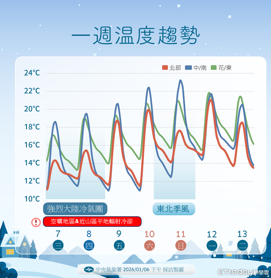 中央氣象署預報員賴欣國表示,今、明天強烈大陸冷氣團及輻射冷卻開始影響,各地明顯降溫,周五至周六強烈大陸冷氣團減弱,但輻射冷卻影響下,早晚溫度仍偏低。