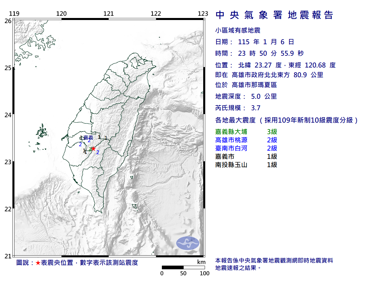 6日晚間11時50分,高雄市那瑪夏區發生芮氏規模3.7地震,震央位於高雄市政府北北東方約80.9公里,地震深度僅5公里,屬極淺層地震。根據中央氣象署資料,這起地震造成嘉義地區出現最大震度3級,高雄與台南地區為2級,嘉義市與南投則為1級。目前尚未傳出災情,氣象署提醒民眾留意後續可能餘震。