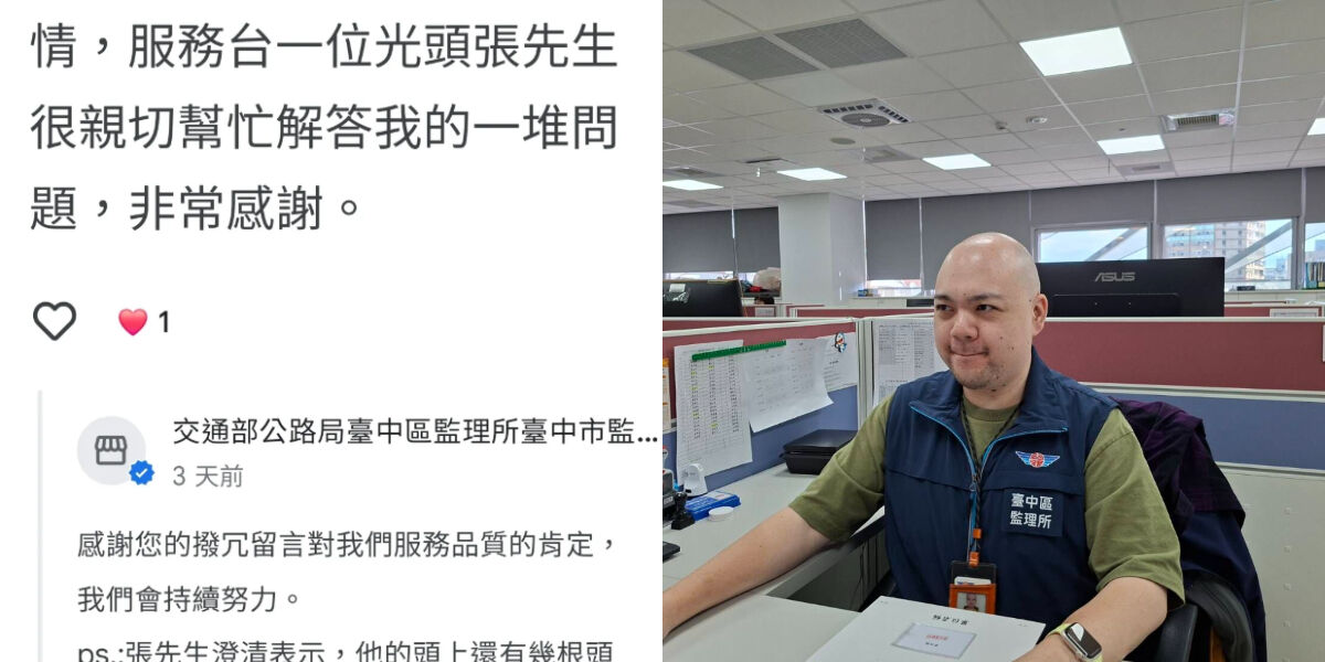 台中監理站一名員工因親切服務態度,民眾特別在Google給予5星讚賞,並寫下「光頭張先生解答我一堆問題」,神展開的是,監理站小編替本尊澄清,其實頭上還有幾根「肉眼不易辨識的頭髮」,稱不上光頭,還釣出交通部長陳世凱親回,會給這位同仁獎勵。如今本尊真實模樣曝光了。