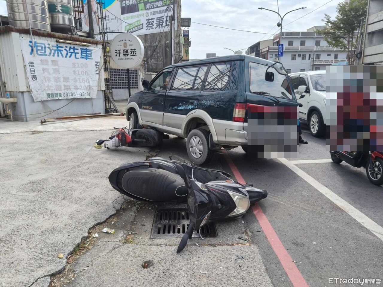 這起猛烈撞擊造成70歲的蘇姓女騎士與63歲的林姓男騎士手腳多處擦挫傷,第一輛機車遭撞倒後,小客車接著又撞上第二輛機車,甚至將機車重重壓在車底,幸好兩名傷者意識都相當清楚,均無生命危險,而肇事的楊姓老翁則沒有受傷。