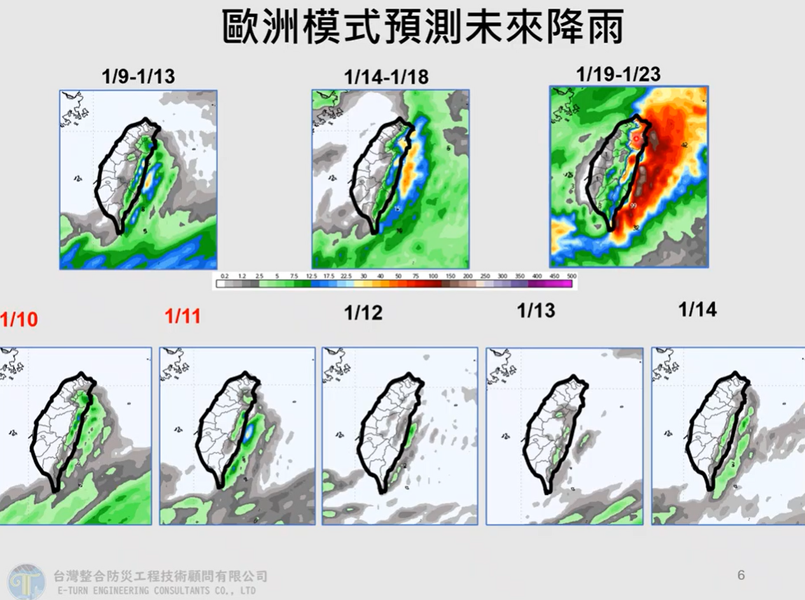 後期天氣趨勢部分,1月下旬起至2月中旬,宜蘭降雨仍以偏多的機率較高,其他地區降雨相對偏少的機率較高。賈新興指出,未來10天,西半部天氣較穩定,東部水氣比較多,但1月19日至23日,東北部水氣變很多,除了宜蘭以外,基隆北海岸、花蓮部分地區降雨明顯,這是後期要特別注意的地方。