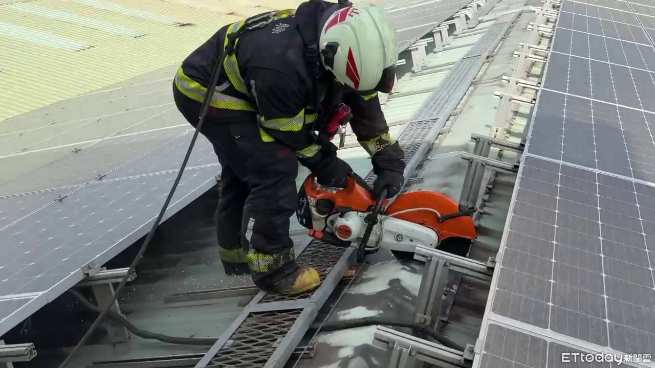 ▲消防員攀上鐵皮屋上方,以電鋸建立開口,方便射水滅火。(圖/記者高堂堯翻攝,下同)