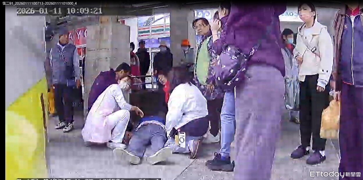 ▲黃金時間救援!百歲長者車站昏厥,休假消防員衝上前CPR搶救。(圖/記者郭世賢翻攝,下同)
