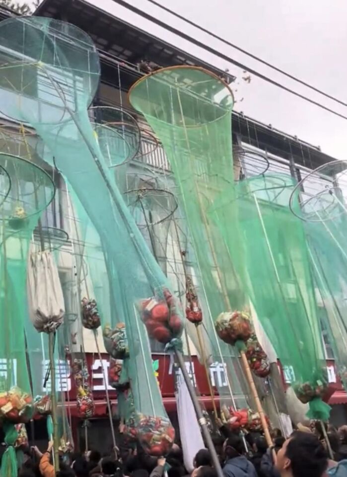 浙江義烏一處新建住宅近日舉行封頂上樑儀式,屋主從頂樓大量拋撒零食、糖果,引來大批民眾到場「接喜」,相較於過去徒手或用臉盆撿拾,現場民眾紛紛拿出大型漁網承接從天而降的喜禮,被當地民眾形容為「接喜工具全面升級」,並稱這是流傳已久的民俗,近年形式也隨時代演變。