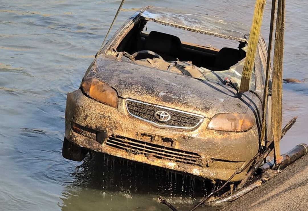 警方調來吊車將車輛打撈上岸,發現車輛前後擋風玻璃都有大面積破裂痕跡,導致河水灌入車內,但車身其他部位並無明顯損傷。而駕駛座上則有一具完整的人類骨骸,研判已在水中浸泡相當長時間。