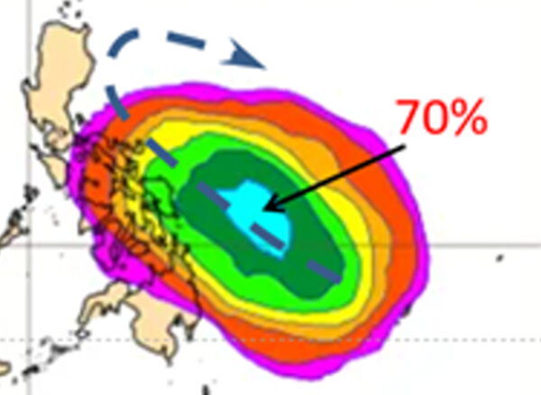 ▲吳德榮說,最新歐洲模式系集模擬顯示,下半周菲律賓東方海面有熱帶擾動發展,周五成颱的機率調高至70%,模擬路徑大致在菲律賓呂宋島東方向東北迴轉。(圖/翻攝「氣象應用推廣基金會」專欄)