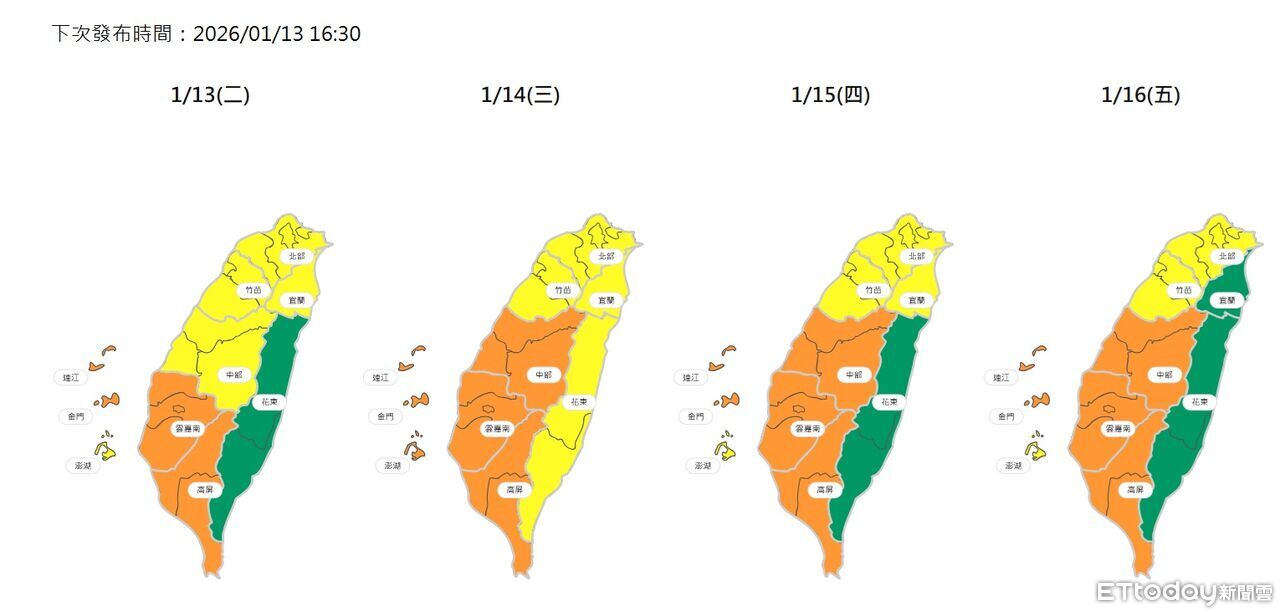 環境部指出,預計明天午後境外污染趨緩,中部以北空氣品質逐漸改善到普通等級;南部地區因位於處下風處,風速弱且擴散條件不佳,境外污染物與本地污染物持續累積,預估橘色提醒等級將持續至周六,但周五影響會開始減弱。
