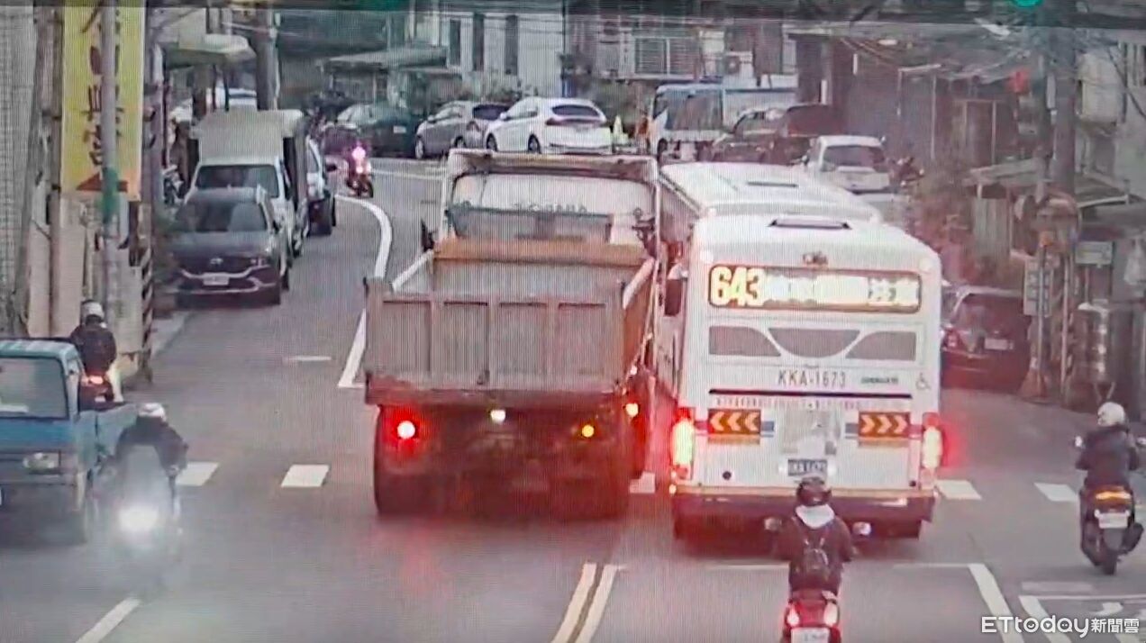 今天清晨6時許,當時913路與643路2輛公車先後在新店區安康路三段538號路邊公車站停靠。後方趙男駕駛的砂石車因不願等候,竟不顧道路狹窄且該處為雙黃線,直接向左重踩油門「逆向」試圖超越2輛公車。不料,此時公車剛好陸續起步離站,趙男見對向車道已有來車逼近,陷入進退維谷的窘境,索性仗著車體龐大向右硬切回原車道,導致砂石車右側車身與643路公車的左前車頭發生擦撞。