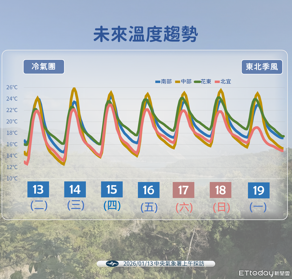 中央氣象署預報員曾昭誠表示,冷氣團預計影響到明天清晨,明天輻射冷卻影響,各地仍偏冷,但都是偏乾環境。明天白天到周五冷氣團減弱,日夜溫差大,各地多雲到晴,僅東半部及恆春有零星雨。