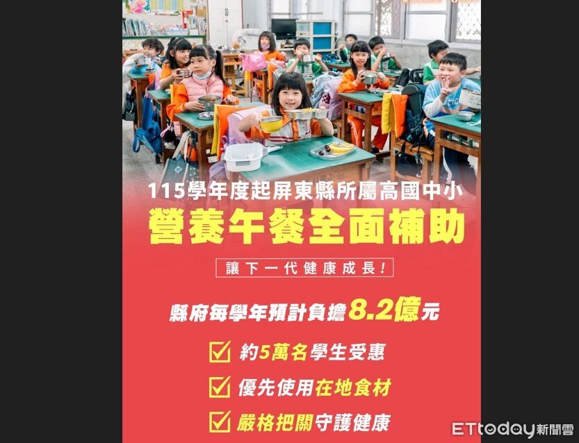 屏東縣也跟進免費營養午餐!屏東縣長周春米於今(14)日宣布,從115學年度開始,屏東縣所屬高國中小,營養午餐全面補助,縣府每學年投入約8.2億元,約有5萬名孩子受惠。周春米強調,這個補助對屏東雖不容易,但為了孩子的健康與平等權,縣府必須勇於承擔。
