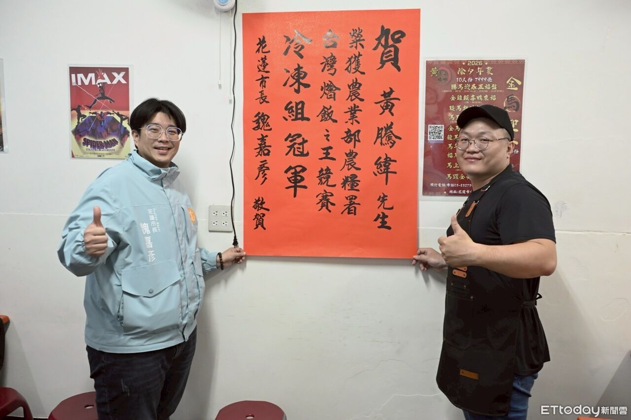 ▲花蓮市長魏嘉彥(左)親赴店家張貼紅榜表達祝賀。(圖/花蓮市公所提供,下同)