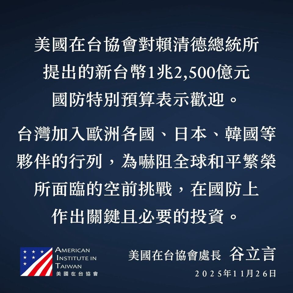 AIT表示,正如葛林(Greene)處長於11月26日在 AIT 社群媒體上的發言所指出,「AIT 歡迎賴清德總統宣布提出新台幣 1.25 兆元的國防特別預算。」