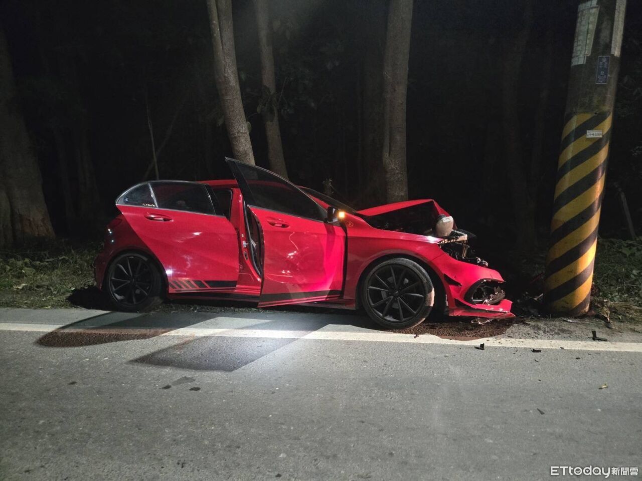 岡山分局今日凌晨2時23分許接獲報案,指稱橋頭區通燕路上發生交通事故。員警到場了解,當時一輛自小客車行駛通燕路往西方向時,行經事故地點疑似未注意車前狀況,偏左行駛撞擊路旁電桿。