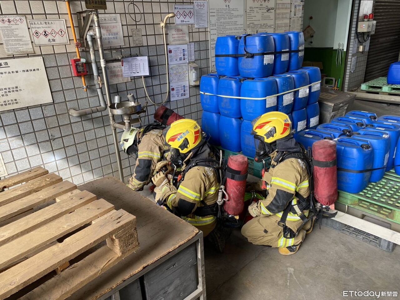 ▲南消新營分隊於榮眾科技新營廠辦理危害性化學品搶救演練,模擬化學品洩漏引發火災。(記者林東良翻攝,下同)