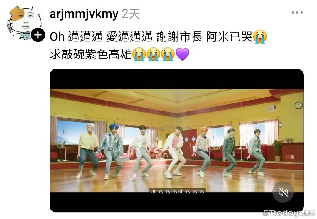 不少粉絲直接改編BTS經典歌曲〈Boy With Luv〉歌詞,向陳其邁告白,有網友留言直呼:「Oh邁邁邁,愛邁邁邁,謝謝市長,阿米已哭,求敲碗紫色高雄」,瞬間引發共鳴;也有人高喊「邁邁我愛你!!!!」、「高雄萬歲 其邁萬歲」、「感恩邁邁 讚嘆邁邁」,留言區宛如大型應援現場。