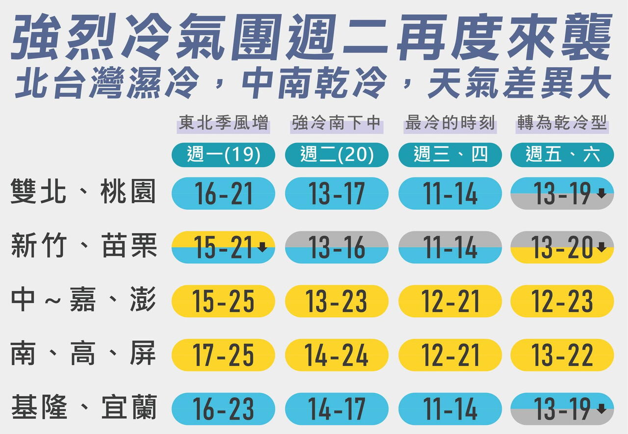 「台灣颱風論壇|天氣特急」臉書提到,這一波不只冷,南北型態差異也很明顯,北台灣水氣偏多,濕冷感受特別強烈,中南部以乾冷為主,日夜溫差大,提醒大家務必留意接下來的天氣變化!