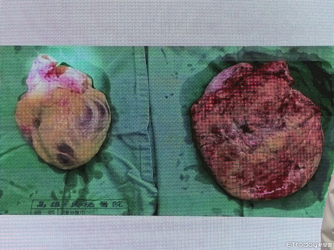 ▲患者的心臟(右)取出時,爛如一塊肉餅;左側心臟為受贈器官。(圖/記者許宥孺攝)