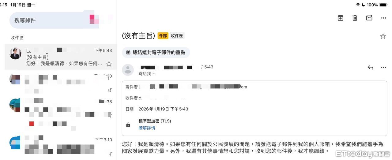 警方指出,該冒名郵件是在1月19日17時43分透過Gmail寄發:內容以「您好!我是賴清德」開頭,聲稱若有關於「公民發展」的問題可寄信至所謂「個人郵箱」,並表示「希望攜手為國家發展貢獻力量」,同時要求收件人先回信才能「繼續討論其他事情」。此類文字明顯為典型釣魚手法,目的在誘導民眾建立聯繫,後續再以各種話術進行詐騙或套取個人資料。