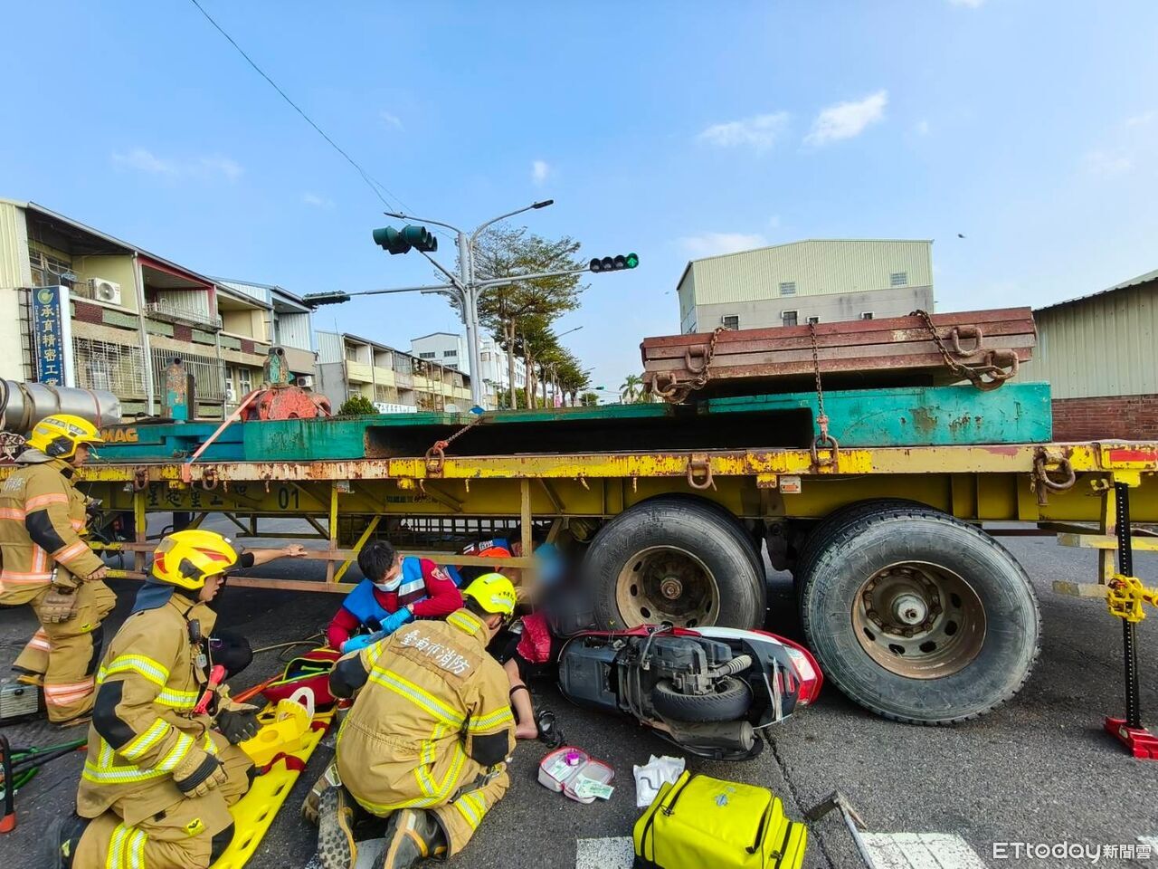 ▲台南市歸仁區中山路一段20日下午發生拖板車與機車事故,女騎士右大腿遭輪胎壓住,消防人員到場搶救。(民眾提供,下同)