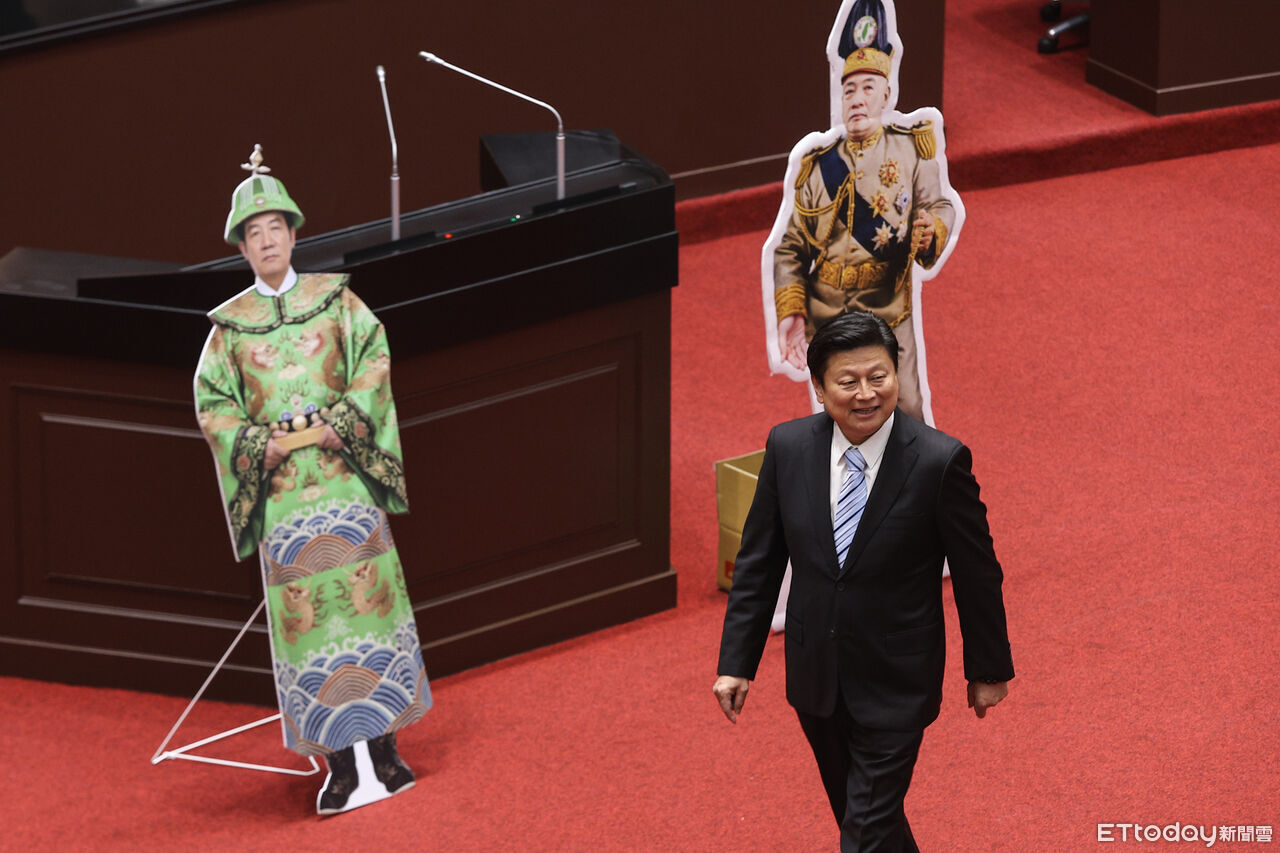 ▲立法院彈劾總統賴清德審查會,傅崐萁與黃國昌準備賴皇人形立牌。(圖/記者林敬旻攝)