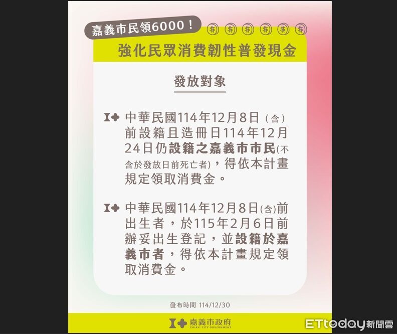 2. 中華民國114年12月8日(含)前出生者,於115年2月6日前辦妥出生登記,並設籍於嘉義市者。
