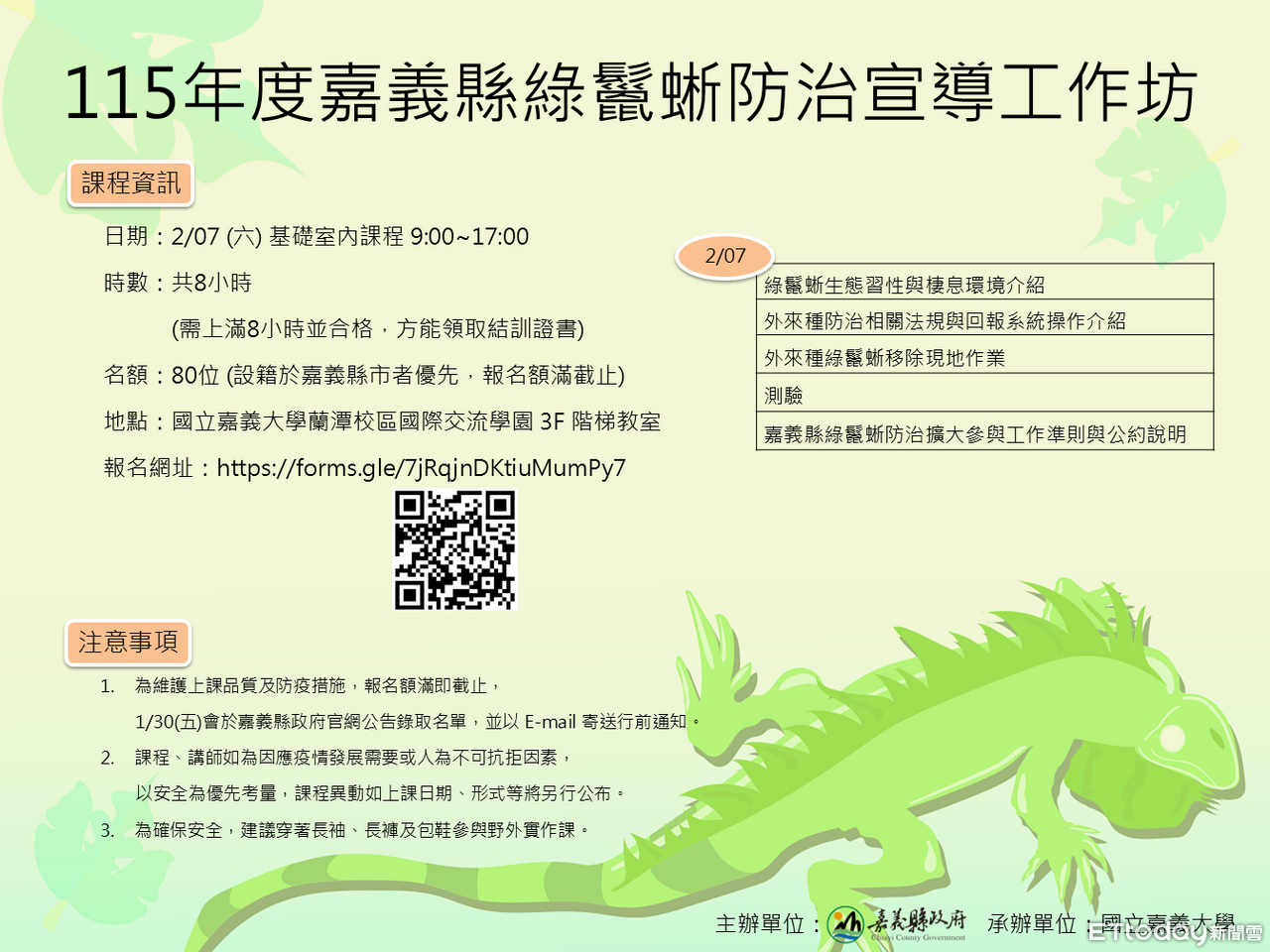 嘉義縣政府為移除外來入侵物種綠鬣蜥,將在115年2月7日於國立嘉義大學舉辦「115年度嘉義縣綠鬣蜥防治宣導工作坊」,參與基礎訓練及實務合格後可加入移除團隊執行移除工作,依據移除個體大小可獲100元或500元之獎勵金。