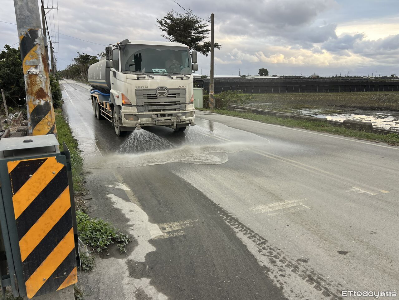 ▲運輸車輛行經便道時,灑水車加強噴灑以抑制揚塵。(圖/記者楊晨東翻攝)