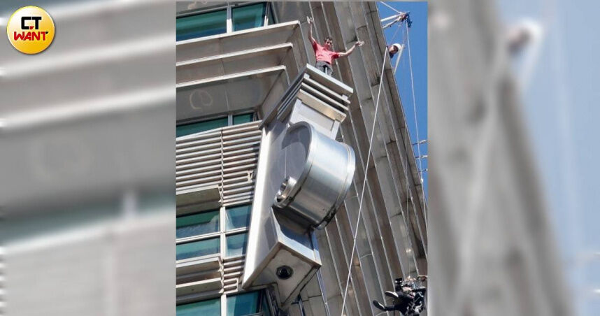 ▲霍諾德挑戰徒手攀登台北101,成功登頂,向下方揮手致意並自拍留念。(圖/CTWANT)