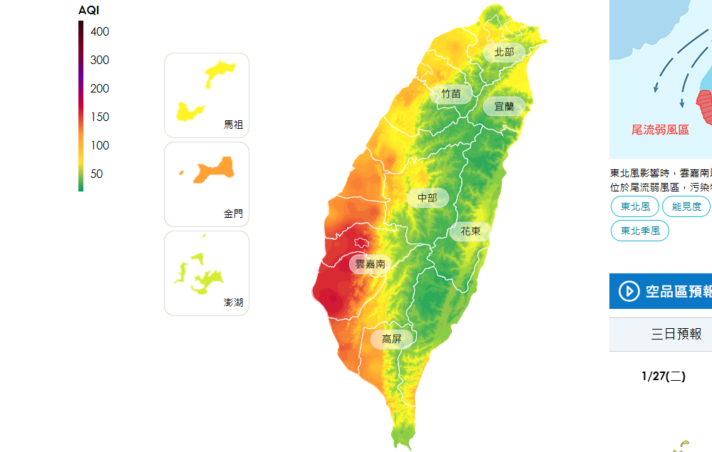 環境部今日也發布最新監測資訊,針對雲嘉南地區發布「紅色警示」,提醒該區域的所有族群都應減少戶外活動。同時,中部、高屏地區以及金門地區則為「橘色提醒」,建議敏感族群應減少戶外劇烈活動。