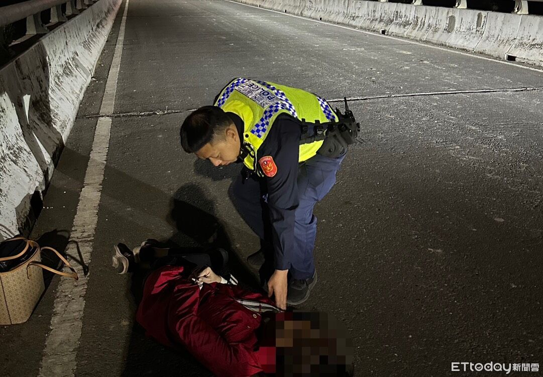 屏東警分局新鐘派出所員警巡經水仙橋時,發現李女倒臥位置緊鄰行車動線,情況萬分驚險。警方第一時間將巡邏車橫擋於後方警示,並上前察看,發現李女意識混亂、無法言語。在等待救護車期間,員警持續監測其呼吸心跳並維持現場交通警戒,確保救援環境安全。