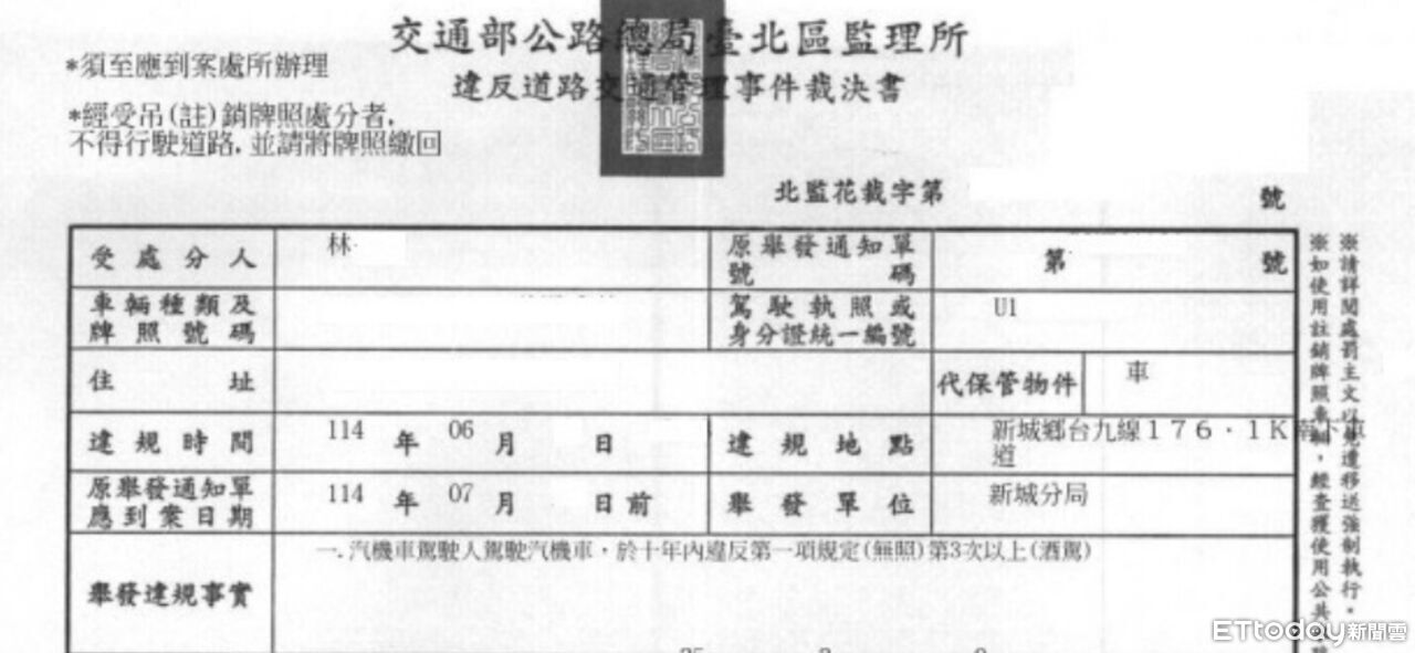 花蓮分署表示,這名林姓男子,於114年6月間不僅無照,甚至酒後騎乘機車,在新城鄉省道台九線路段遭新城分局員警查獲,因林男屬酒駕累犯,花蓮監理站依道路交通管理處罰條例第35條第3項規定重罰45萬元,3年內不得考領駕照,並應參加道路交通安全講習,公布姓名、照片及違法事實。