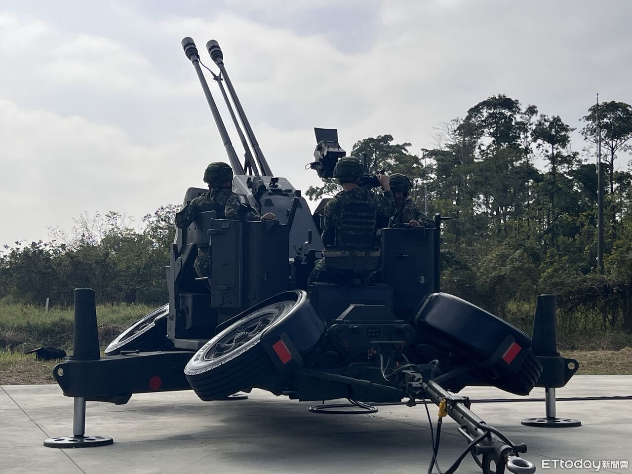 空軍第795旅今(28日)展示由天兵雷達、35公厘雙管防空快砲(GDF-006)與麻雀飛彈發射架組成的「彈砲合一」35快砲系統砲操。儘管35快砲系統被視為老舊設備,但傳出若能解決雷達問題,擬納入「台灣之盾」,負責擊殺無人機群。空軍連長邱耀霆少校表示,35快砲使用的高效能摧毀彈,在爆炸後會瞬間形成內含152顆鎢鋼珠的綿密攔截彈幕,能有效攔截低空的突襲戰機、巡弋飛彈,比較大型的無人機跟攻擊無人機,也可由35快砲實施射擊。