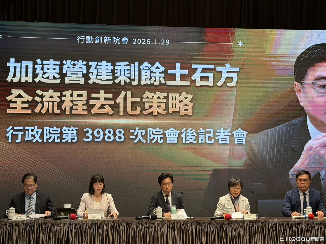 發言人李慧芝轉述,院長卓榮泰在會中裁示,為解決營建剩餘土石方去化問題,並杜絕不肖業者非法棄置行為,核定了「廢棄物管理及資源化行動方案」及「營建剩餘土石方最終去處規劃方案」,盤點陸域、海域、港域等最終的去處,要求源頭減量及土方交換等做法,強化營建剩餘土石方處理方式,並要求強化清運處理機構運用GPS,以及衛星與無人空拍等科技管理,加強稽查執法。