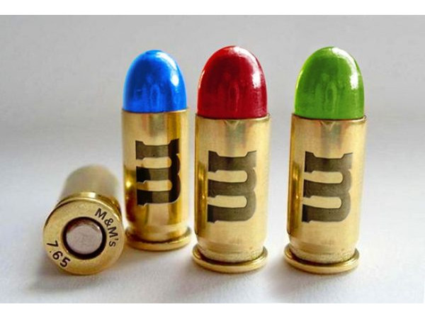 子彈頭上面有著斗大的m字與彩色塗裝,原本應該是什麼呢?很明顯~是「只溶你口,不溶你手的」M&M's巧克力,應該帶來甜甜的歡樂感,一樣圓圓的外觀,變成具殺傷力的子彈。