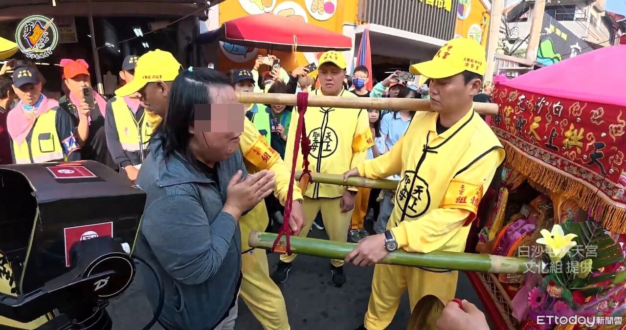 ▲林婦失蹤後,媳婦邱女13日向白沙屯媽祖鑾轎祈求早日找到婆婆,一度情緒激動落淚。(圖/翻攝白沙屯媽祖進香直播)