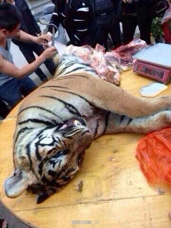 這組當街宰殺老虎的照片,引發大陸網友瘋狂轉貼,網易新聞報導,虎皮交易已經被嚴令禁止,目前只有黑市上可獲得,由於國家嚴厲打擊,現在基本已經無貨,極可能是造假。