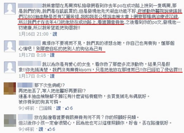 林女16日在新主人臉書上留言,「我無意間在馬爾濟斯協尋網看到你去年po在成功路上撿到一隻馬爾,那是我們的狗」,表示小狗先天凝血功能不好,動物醫院建議花800元抽血檢驗,但她和老公覺得檢驗很貴,且之後治療很花錢,因此2013年4月3日把狗放在成功路上,「看誰願意養,之後看到po文,現在發現牠一切健康,所以希望能把狗還我!」