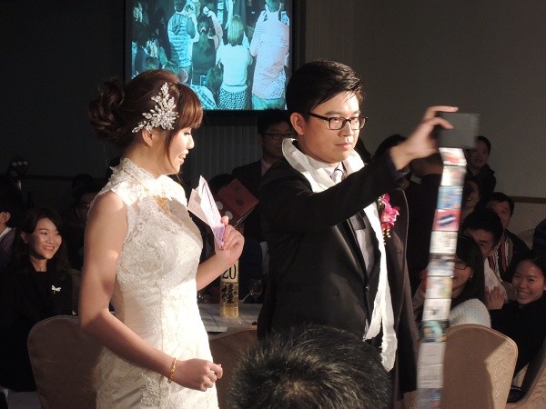 晶宴會館婚宴秘書部賴副理表示:「因為這組新人酷愛賭神系列電影,是新郎從小到大的回憶,新郎也不時會用電影裡的橋段來娛樂身邊的親人及朋友,更是夫妻兩人之間的感情潤滑劑,所以在籌畫婚禮的階段,就建議可以用賭神風格的主題式婚禮進行呈現,希望能讓賓客有個不同的婚禮回憶。」婚禮現場更安排新郎與新娘互贈禮物,新郎送給新娘信用卡及鈔票,要讓新娘不用為了婚後的生活開銷而擔心,而新娘回贈脆笛酥給新郎,希望新郎能夠為了身體的健康開始戒菸。