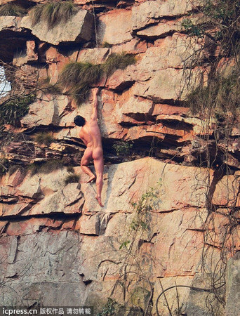 大陸一名攀岩愛好者、有「亞洲蜘蛛人」之稱的李童星,25日挑戰裸體攀爬張家界的「草泥馬峰」,只見他徒手順著錯落的岩層,小心翼翼地往上爬。但因為風力太強,最後他還是穿上護具,成功登頂。李童星說,光著身體攀岩,是表達自由和自然的結合。