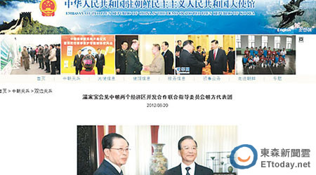 ▼中國駐北韓大使館的網頁中,仍有張成澤當年跟溫家寶握手的照片。(圖/中國駐北韓大使館官網)
