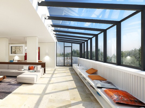 使用位於頂樓的優勢,將突出的陽台部分加上玻璃,形成半露天的室內空間,淺色系的地板與牆面,能將太陽光反射到房間較深處,充分發揮自然採光的功效。