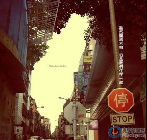 服貿協議的爭議未歇,人民選擇用各自的方式表達意見與心聲。一張圖不僅能勝過千言萬語,更能撫慰人心。言忍巾貞工作室拍攝的一張「台灣天空圖」,最近在臉書被超過3萬人按讚或分享,圖片裡的文字寫道,「雖然團結不夠,但是我們住在一起。」