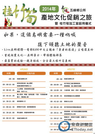 如果這個島嶼需要一種吶喊,跪下傾聽土地的聲音──探索五峰・原鄉純粹!新竹縣五峰鄉將於4月26、27日舉行原鄉感動之旅,2014五峰鄉桂竹筍節產地文化促銷之旅,希望能凸顯真正的產地-人×物×泥土所形塑的「生活文化地景」,展現孕育原鄉桂竹筍的獨特味道。