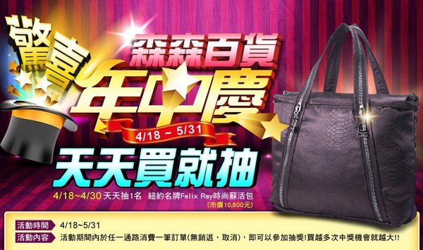 此外,東森購物、森森購物年中慶於4月18日起登場,首波活動推出「買就抽,天天送」,即日起至5月30日期間,全通路不限消費金額,下單就可參加抽獎,將分別送出紐約Felix Rey時尚蘇活包、紐約Felix Rey時尚菱格紋經典包、SWAROVSKI項鍊,共計200個獎項。
