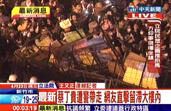 公投盟與反核團體22日晚間在立院與警爆發衝突!蔡丁貴晚間要求群眾推拒馬,但自己與王奕凱等人因衝過拒馬被警方抓走,蔡丁貴甚至傳出被上手銬,引起第二波衝突,民眾希望警方釋放蔡丁貴。一些人紛紛上林飛帆、陳為廷臉書留言,希望他們可以出面聲援蔡教授。